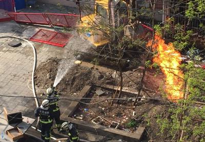 在事发居民楼下,与居民楼平行方向有一条约50米长的浅沟,浅沟两边用栏杆围起来,居民从大门进入院内后,要想上楼,必须沿着浅沟和居民楼之间的狭长通道进入。浅沟的尽头停有一辆钩机,钩机旁边的燃气管道喷出熊熊火焰。