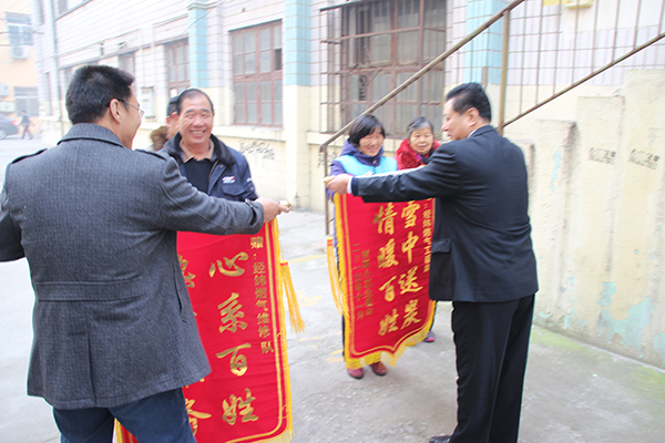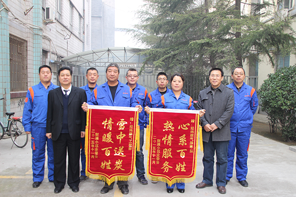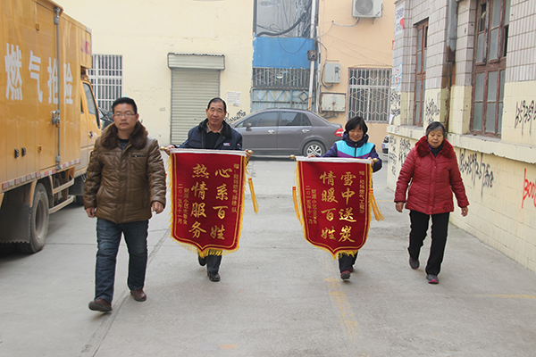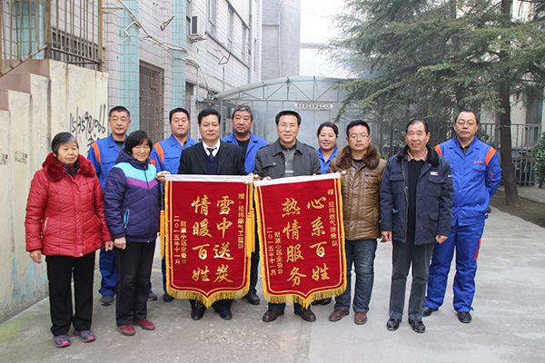 2015年11月29日,财源小区的业主代表捧着“雪中送炭 情暖百姓” 、“心系百姓 热情服务”两面锦旗,送到市经纬燃气公司工程部和维修队。
